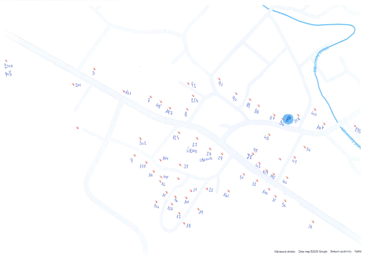 část obce - od d.č. 38 a 46 směr Krucemburk ( vč. náměstí a oblasti za obecním úřadem sm.