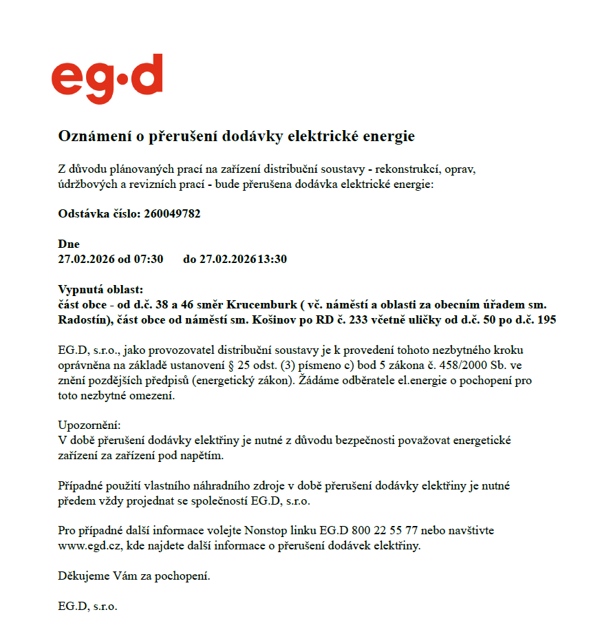 Dne 27.02.2026 od 07:30 do 27.02.2026 13:30
