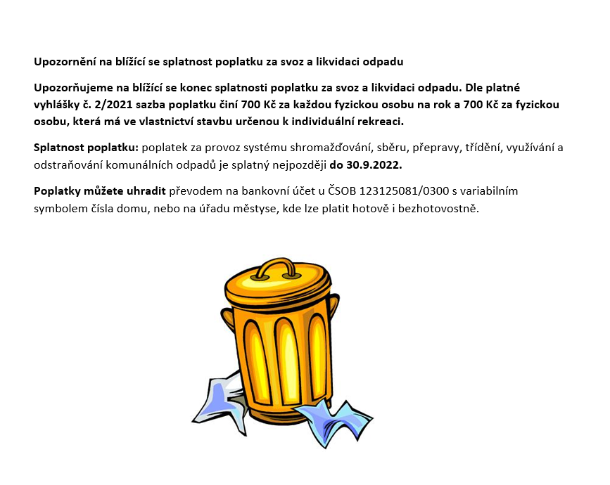 Upozornění na blížící se splatnost poplatku za svoz a likvidaci odpadu Vystaveno: 21.10.2023 Vystavil: Superadmin Superadmin Oznámení úřadu Přílohy odpady.png Obrázek, 158.37 KB Stáhnout Podrobnosti Datum vystavení: 21.10.2023