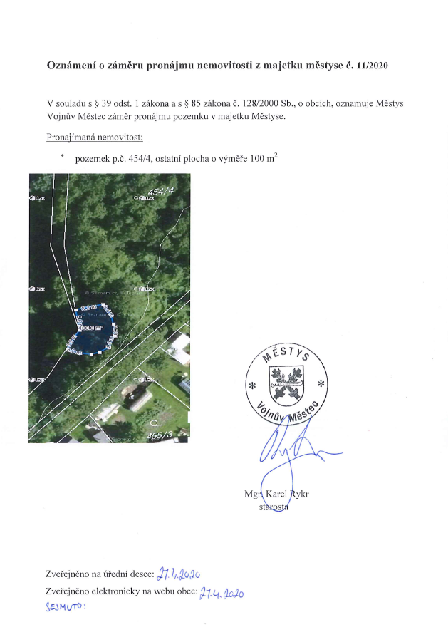 Oznámení o záměru pronájmu nemovitosti z majetku městyse č. 11/2020 Vystaveno: 27.4.2020 Vystavil: Superadmin Superadmin Záměry městyse Přílohy ivouš.png Obrázek, 337.25 KB Stáhnout Podrobnosti Datum vystavení: 27.4.2020