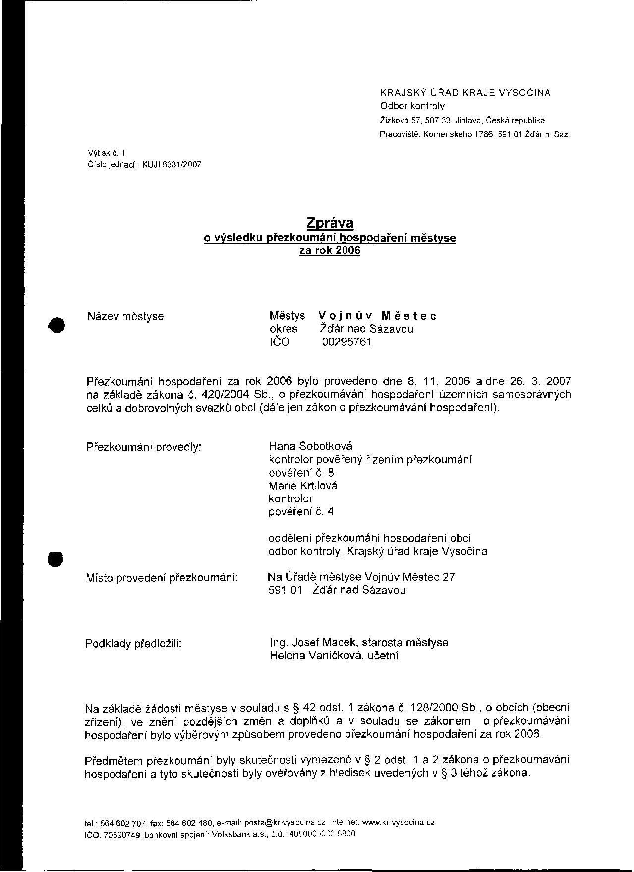 Zpráva o kontrole hospodaření městyse Vojnův Městec Vystaveno: 16.4.2007 Vystavil: Tomáš Mocek Úřední deska Zpráva o kontrole hospodaření městyse Vojnův Městec za rok 2006 Přílohy zprava1.jpg Obrázek, 212.38 KB Stáhnout zprava2.jpg Obrázek, 293.70 KB Stáhnout Podrobnosti Datum vystavení: 16.4.2007