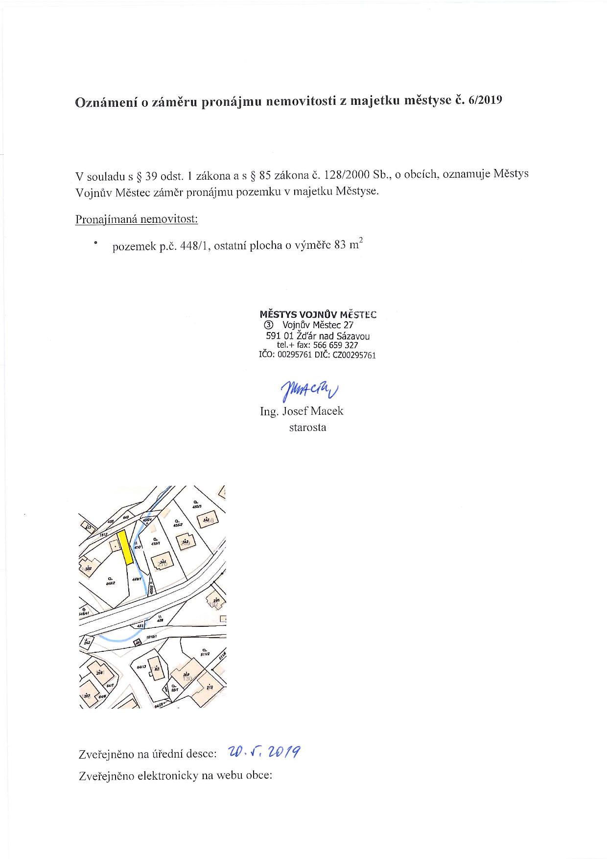 Oznámení o záměru pronájmu nemovitosti z majetku městyse č. 6/2019 Vystaveno: 20.5.2019 Vystavil: Tomáš Mocek Záměry městyse Přílohy záměr6.2019.jpg Obrázek, 131.51 KB Stáhnout Podrobnosti Datum vystavení: 20.5.2019