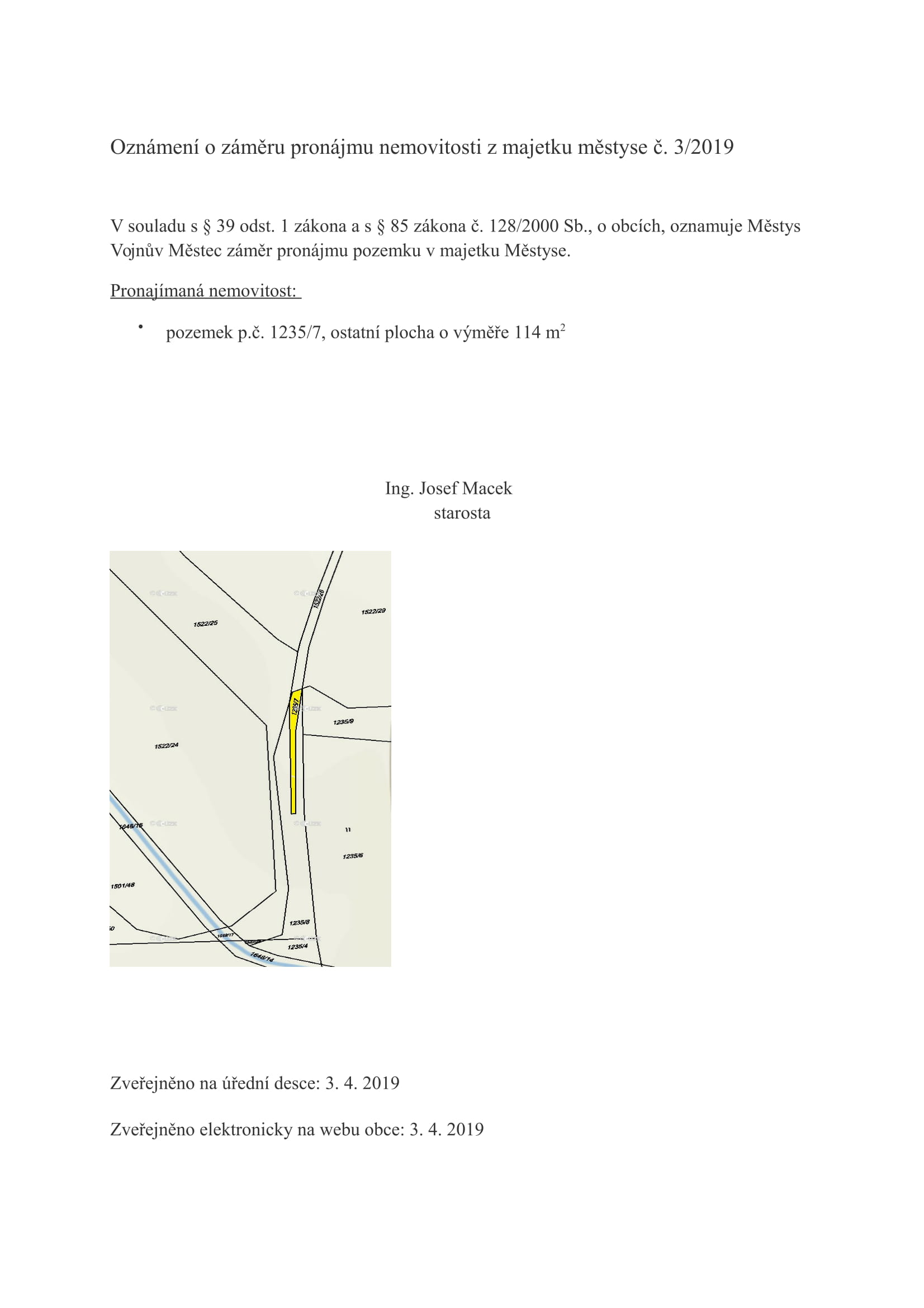 Oznámení o záměru pronájmu nemovitosti z majetku městyse č. 3/2019 Vystaveno: 3.4.2019 Vystavil: Tomáš Mocek Záměry městyse Přílohy Záměr - Kamenička-1.jpg Obrázek, 113.27 KB Stáhnout Podrobnosti Datum vystavení: 3.4.2019