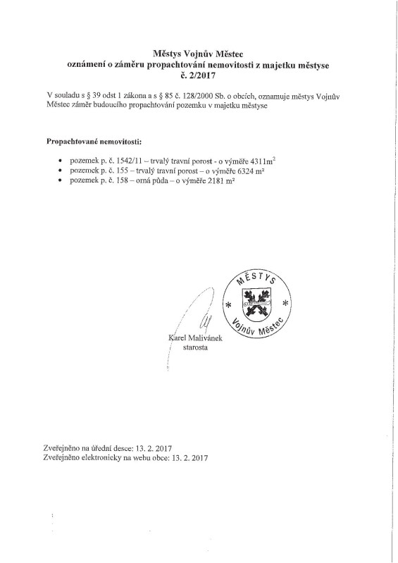 V souladu s § 39 odst 1 zákona a s § 85 č. 128/2000 Sb. o obcích, oznamuje městys Vojnův Městec záměr budoucího propachtování pozemku v majetku městyse