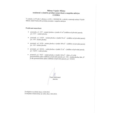 Oznámení o záměru prodeje nemovitostí z majetku městyse č. 8/2016.