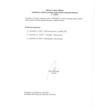 oznámení o záměru prodeje nemovitosti z majetku městyse č. 7/2016
