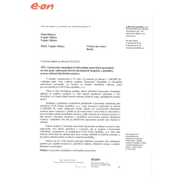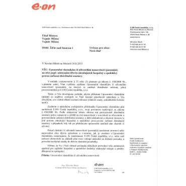 Zasláním a následným zveřejněním přiloženého Upozornění vlastníkům plní společnost E.ON Česká republika, s. r. o., svoji povinnost vyplývající ze zákona č. 458/2000 Sb. Podle ustanovení tohoto zákona má provozovatel distribuční sousstavy právo vstupovat a vjíždět na cizí nemovitosti v souvislosti se zřizováním a provozováním zařízení distribuční soustavy, a dále odstraňovat a ořezávat stromoví a jiné porosty ohrožující bezpečné a spolehlivé provozování zařízení distribuční soustavy v případech, kdy tak po předchozím upozornění neučinil sám vlastník či uživatel.
