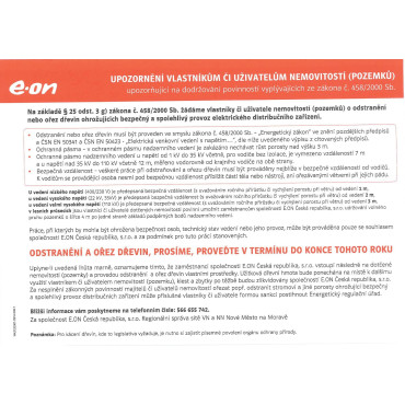 Pokud vlastníci či uživatelé nemovitostí (pozemků) neodstraní stromoví nebo neprovedou ořez dřevin způsobem a v termínu, jak je uvedeno v Upozornění vlastníkům, oznamujeme, že zaměstnanci E.ON Česká republika, s. r. o. nebo naši smluvní zhotovitelé na základě plné moci vstoupí následně na dotčené pozemky a provedou nezbytné zásahy do dřevin vlastními prostředky.