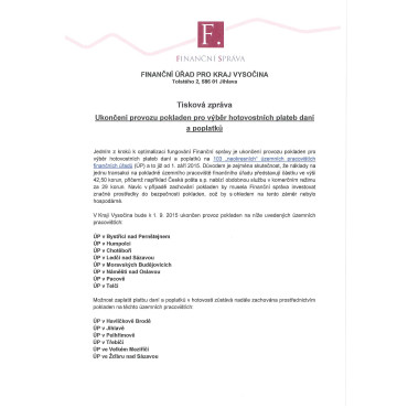 V Kraji Vysočina bude k 1. 9. 2015 ukončen provoz pokladen na níže uvedených územních pracovištích: