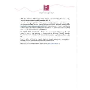 Pro nejbližší období placení daně z příjmů a daně z nemovitých věcí připravuje Finanční správa pro občany i další alternativu pro platby v hotovosti, jakou byla v minulosti například tzv. „daňová složenka", která umožňovala platit daně bezplatně na přepážkách České pošty s.p.